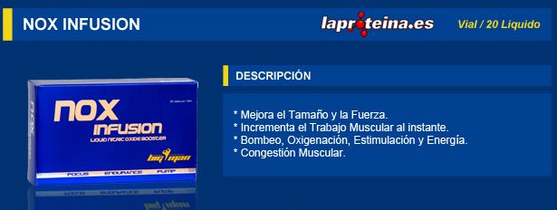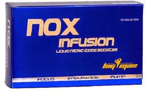 NOX Infusion de BigMan Nutrition es una fórmula líquida en viales monodosis diseñada específicamente para potenciar la producción de óxido nítrico gracias a la su exclusiva mezcla de arginina alfa cetoglutarato con la acetil L-carnitina.