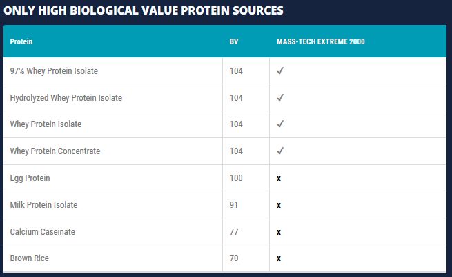 A diferencia de la mayoría de ganadores de peso del mercado, Mass-Tech Extreme 2000 solo contiene fuentes proteicas procedentes del suero de leche. Su mezcla proteica incluye concentrado de proteína de suero de leche, aislado de proteína de suero de leche 97%, aislado de proteína de suero de leche y aislado de proteína de suero de leche hidrolizado.