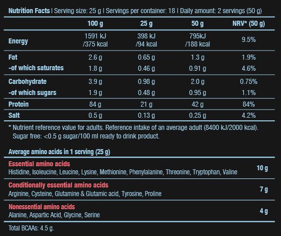 Sabor chocolate: Iso Whey Zero Blend 90% [aislado de proteína de suero de leche, L-glutamina, BCAAs (L-Leucina, L-Isoleucina, L-Valina)], cacao en polvo, aromas, aceite de coco total y parcialmente hidrogenado (contiene leche), espesante (carboxi metil celulosa sódica), emulsionante (lecitina de soja), sal, edulcorantes (sucralosa, glicósidos de esteviol), vanilina.