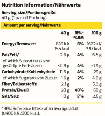 6 bolsas de 40 gramos. Deliciosos snacks salados con 20 gramos de proteína por bolsa de 40 gramos.