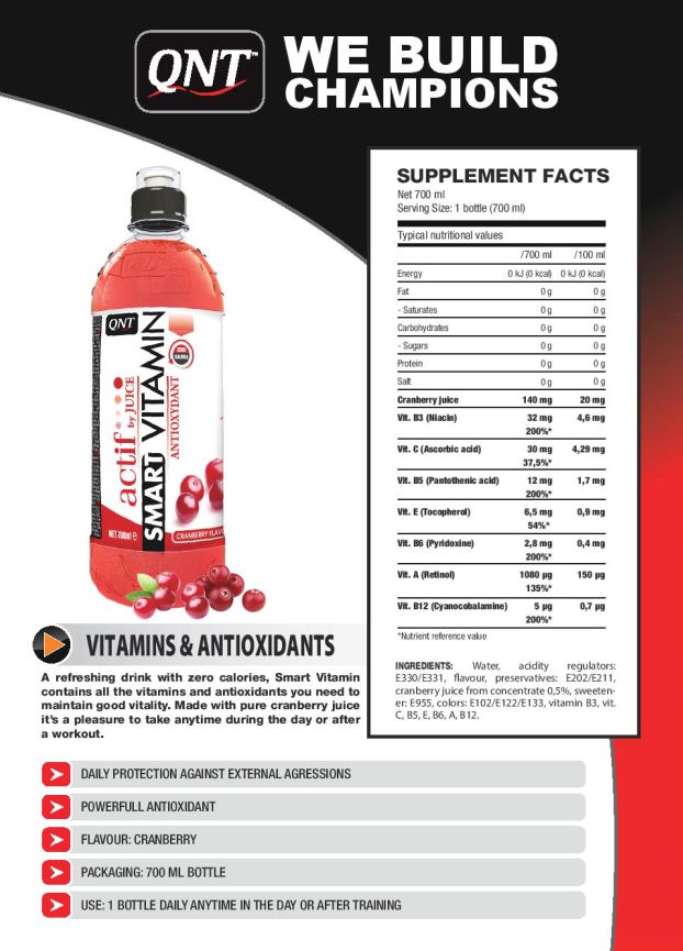 Smart Vitamin de QNT es una refrescante y deliciosa bebida sin calorías, que contiene todas las vitaminas y antioxidantes que necesita para mantener una buena vitalidad.