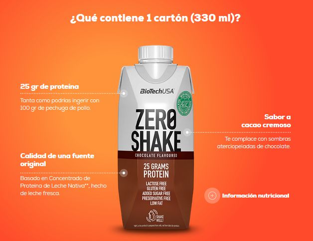 Zero Shake de BioTech USA es el nuevo batido proteico listo para tomar en cualquier momento con un sabor irresistible, sin azúcares añadidos, sin lactosa y que te proporciona 25 gramos de proteína procedente del concentrado de proteína de suero de leche nativa de alta calidad.