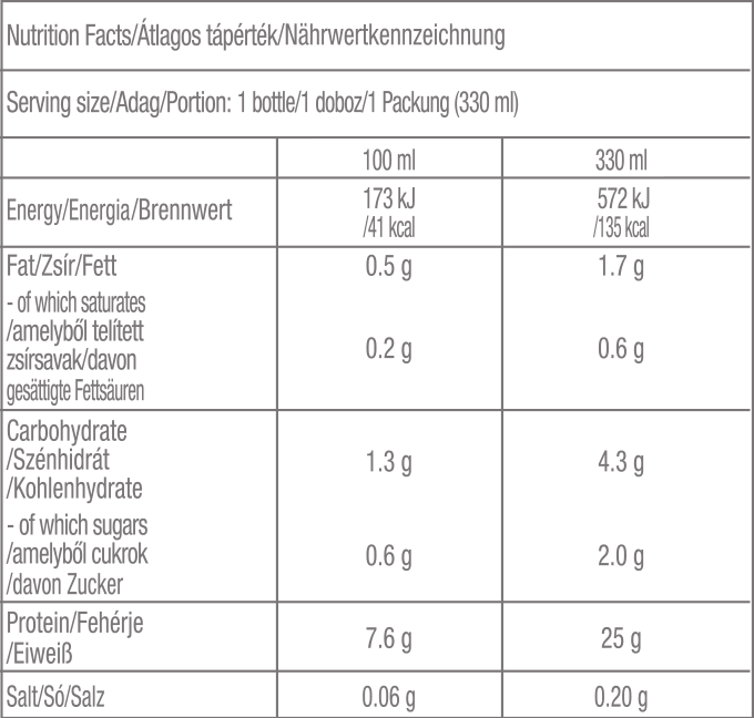 Sabor a chocolate y sabor a chocolate caramelo: agua potable, concentrado de proteína de leche en polvo 9,4%, cacao en polvo bajo en grasa, aromas, emulgente: lecitinas, edulcorante (sucralosa), sal, estabilizante (carragenanos), corrector de la acidez (fosfatos de sodio).