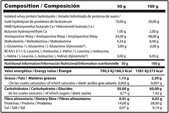 Fórmula todo en uno para después de entrenar. Contiene aislado hidrolizado de suero, amilopectina, maltodextrina, L-glutamina, BCAAs y HMB