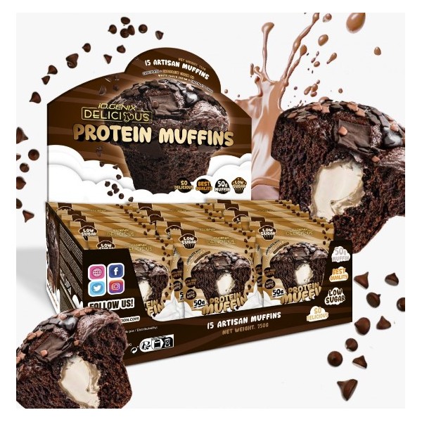 Protein Muffins de IO.Genix son unas deliciosas magdalenas artesanales con chips de chocolate muy bajas en azúcar disponibles en dos irresistibles versiones: magdalena de chocolate con crema de chocolate blanco y magdalena de chocolate con crema de chocolate negro.
