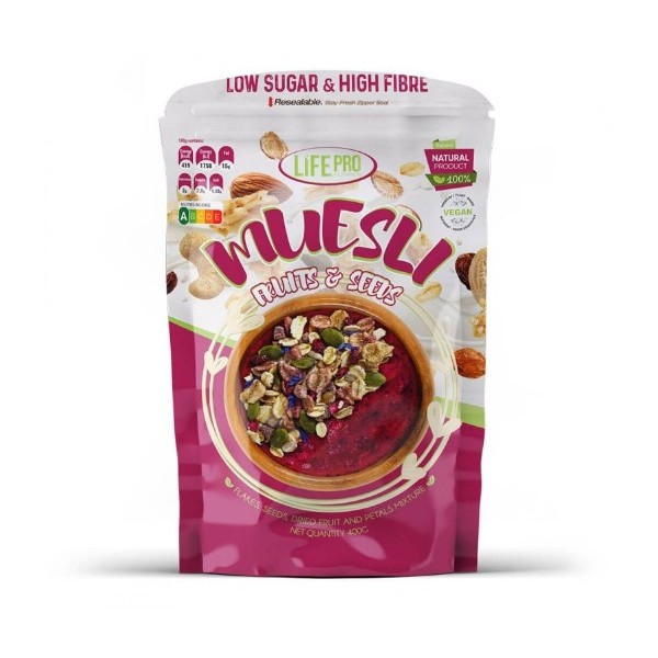 Muesli Fruits & Seeds de LifePro Nutrition es un muesli que contiene un alto contenido de fibra natural, procedente de sus cereales integrales, semillas y frutas deshidratadas.