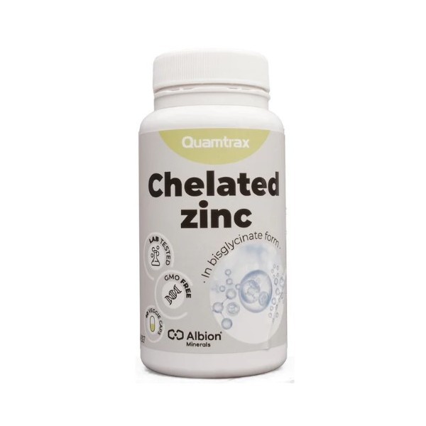 Chelated Zinc de Quamtrax Nutrition es un suplemento en cápsulas vegetales que proporciona 125 mg de bisglicinato de zinc con patente de Albion®, lo que garantiza que tu cuerpo reciba una dosis óptima de zinc en su forma más biodisponible, asegurando que disfrutes de todos los beneficios de este mineral esencial.
