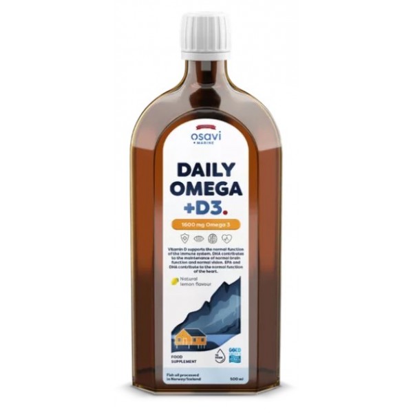 Daily Omega +D3 de Osavi es un suplemento en formato líquido y con un agaradable sabor a limón que contiene aceite de pescado altamente concentrado y purificado que contiene ácidos grasos insaturados esenciales (DHA y EPA) y enriquecido con vitamina D3.