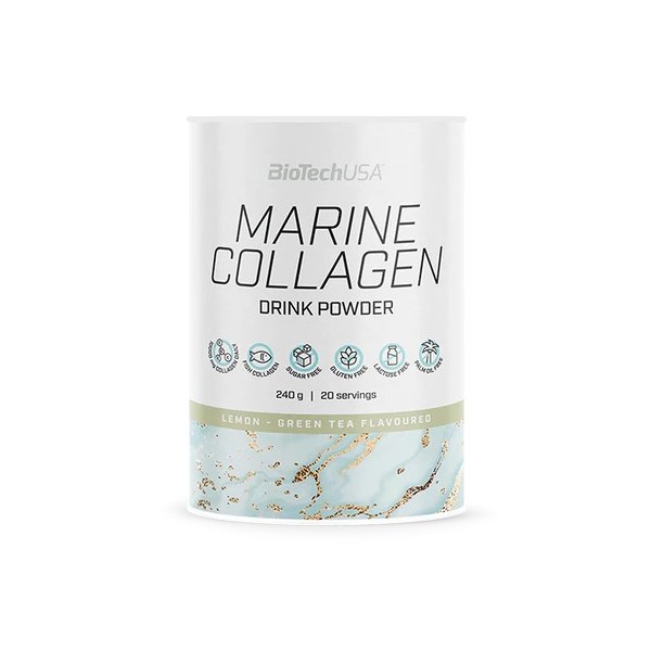 Marine Collagen de BioTech USA es un suplemento en polvo con un delicioso sabor a té verde con limón que proporciona 10 gramos de colágeno procedente de pescado enriquecido con vitamina C.