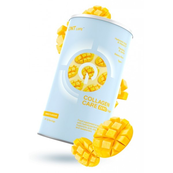 Collagen Care Zero de QNT es un suplemento en polvo a base de colágeno bovino hidrolizado, ácido hialurónico y vitamina C.