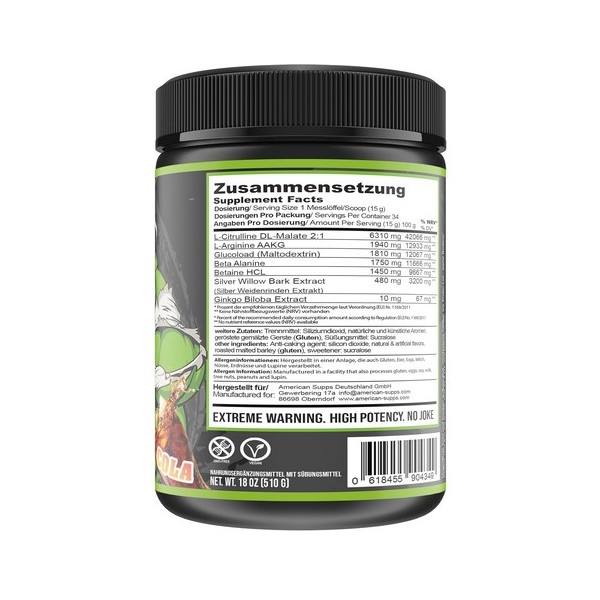 L-citrulina DL-malato 2:1, L-arginina AAKG, glucoload (maltodextrina), beta-alanina, betaína HCL, extracto de corteza de sauce blanco, extracto de ginkgo biloba, antiaglomerante: dióxido de silicio, aromas naturales y artificiales, edulcorante: sucralosa, colorante: carmín.
