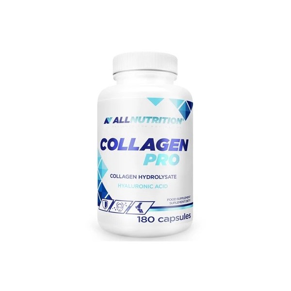 Collagen PRO de AllNutrition es un suplemento en cápsulas que contiene colágeno hidrolizadode tipo II de la más alta calidad, extracto de Boswellia serrata, ácido hialurónico, sulfato de condroitina, sulfato de glucosamina, cúrcuma, vitaminas y minerales.