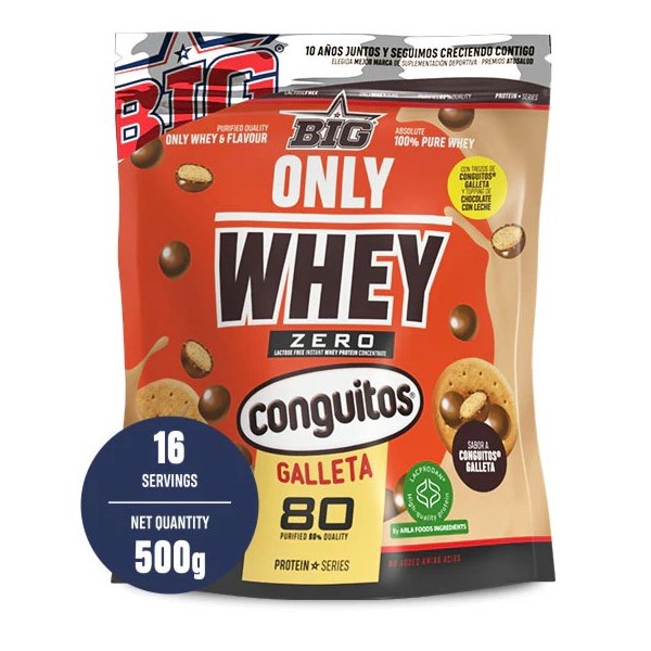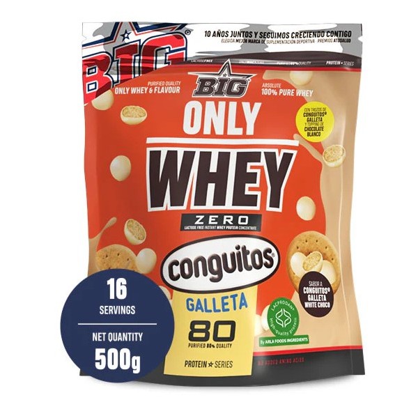 Descubre la nueva proteína Only Whey™ Zero Conguitos Galleta fruto de una nueva colaboración de Big® y Lacasa®. Disfruta ya de su auténtico sabor a crema de galleta ¡con toppings de galleta crujiente y chocolate!, ahora disponible por tiempo limitado con la calidad y seguridad que ofrece la proteína de concentrado de suero 80% de la casa. Un auténtico Best Seller que ha ido evolucionando en su elaboración y pureza desde su primer lanzamiento en 2014.