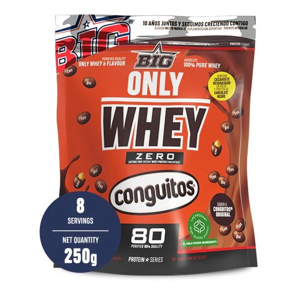 Descubre la nueva proteína Only Whey™ Zero Conguitos® fruto de una nueva colaboración de Big® y Lacasa®. Disfruta ya del genuíno sabor que te acompañó durante toda tu infancia ¡con polvo de cacahuete desgrasado y trozos de chocolate!, ahora disponible por tiempo limitado en su sabor ORIGINAL y en versión WHITE en la proteína de concentrado de suero 80% de la casa. Un auténtico Best Seller que ha ido evolucionando en su elaboración y pureza desde su primer lanzamiento en 2014.