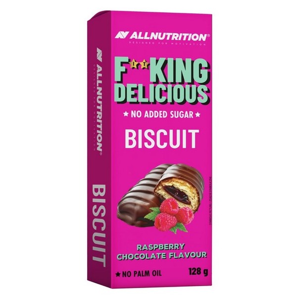 Fitking Delicious Biscuit Raspberry Chocolate de AllNutrition son unas deliciosas galletas cubiertas chocolate, con un irresistible relleno con sabor a frambuesa, elaboradas sin azúcares añadidos ni aceite de palma.