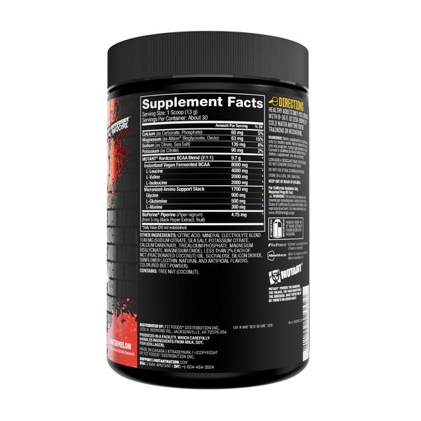Hardcore BCAA de Mutant® es una fórmula en polvo a base de aminoácidos solubles que proporciona 8 g de aminoácidos ramificados instantaneizados obtenidos por fermentación vegetal en una proporción 2:1:1 (leucina:isoleucina:valina), reforzados con 1.7 g de otros importantes aminoácidos micronizados (glicina, L-glutamina, L-alanina), una mezcla de electrolitos para mejorar la hidratación y Bioperine® para mejorar la biodisponibilidad.