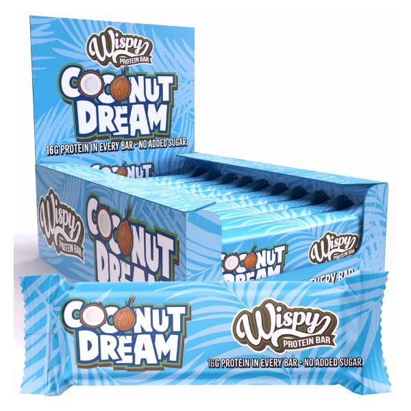 Wispy Protein Bar Coconut Dream de Wispy Nutrition son unas deliciosas barritas altas en proteína con una irresistible cobertura de chocolate con leche y un sabor que no te dejará indiferente.