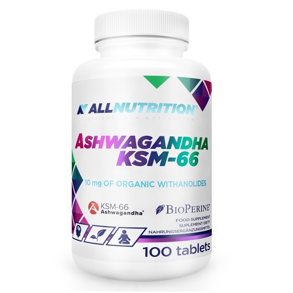 Ashwagandha KSM-66 de AllNutrition es un suplemento en tabletas que proporciona 200 mg de extracto orgánico de raíz de Withania somnifera KSM-66 (10 mg de withanólidos), por dosis de media tableta, enriquecido con BioPerine® para una mayor abosrción y biodisponiblidad.
