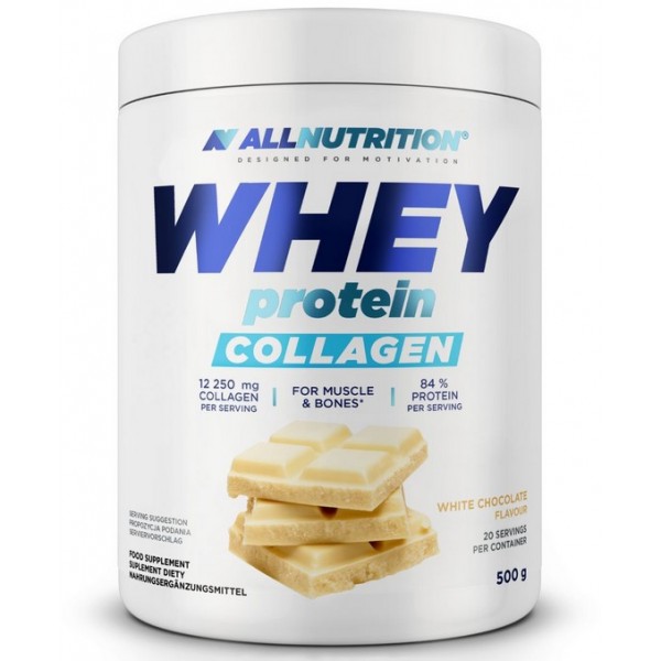 Whey Protein Collagen de AllNutrition es un suplemento proteico en polvo que contiene una combinación de concentrado de proteína de suero de leche y péptidos de colágeno bovino, de forma que no solo proporciona un excelente apoyo para desarrollar músculos fuertes y grandes, sino que también promueve una regeneración completa del cuerpo y unos huesos saludables.