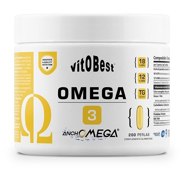 Omega 3 AnchOmega de Vitobest es un suplemento en perlas a base de aceite de pescado concentrado TG 18/12 (AnchOmega®) y vitamina E, diseñado para aquellas situaciones donde se requiere un mayor impacto fisiológico.