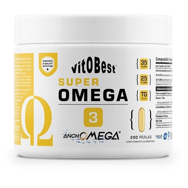 Super Omega 3 AnchOmega de Vitobest es un suplemento en perlas a base de aceite de pescado concentrado TG 35/25 (AnchOmega®) de alta potencia y vitamina E, diseñado para aquellas situaciones donde se requiere un mayor impacto fisiológico.