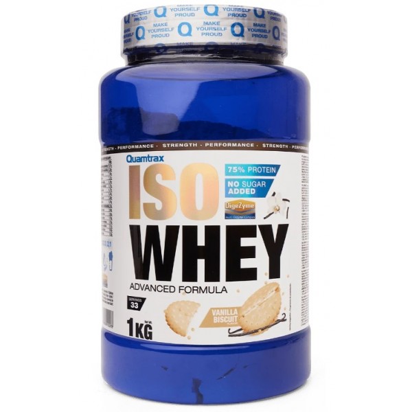 IsoWhey de Quamtrax Nutrition es un suplemento proteico en polvo que contiene una mezcla de aislado y concentrado de suero de leche obtenido por microfiltración de flujo cruzado, un proceso por el que se consigue una proteína que mantiene un valor biológico muy alto, pero con unas bajas concentraciones de lactosa, grasa y carbohidratos.