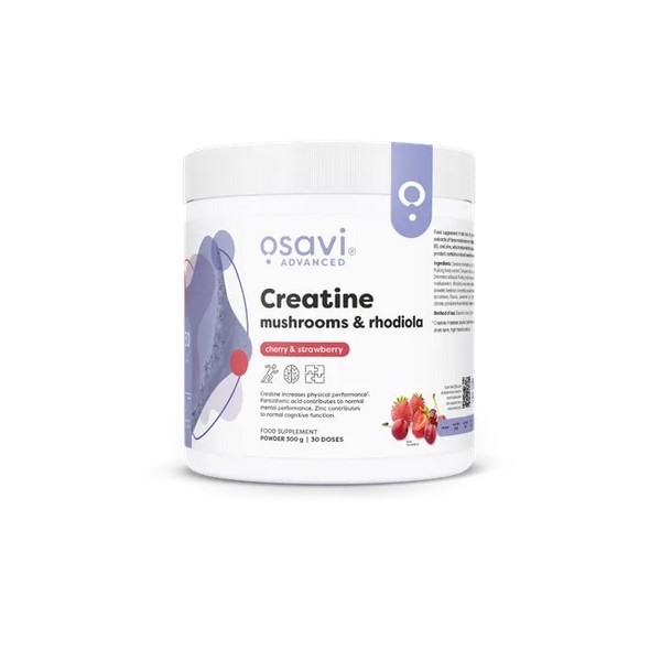Creatine Mushrooms & Rhodiola de Osavi es un suplemento en polvo que contiene creatina para mejorar el rendimiento físico, extractos de tres hongos: melena de león (Lion’s Mane), Cordyceps sinensis, Chaga, así como vitaminas B6, B5 y zinc, que ayudan a mantener la función cognitiva normal.