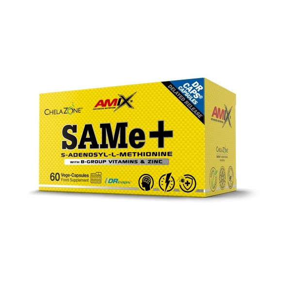 SAMe+ de Amix™ Nutrition es un suplemento alimenticio en cápsulas vegetales de liberación retardada que combina S-adenosil-L-metionina (SAMe) con vitaminas del grupo B y zinc.