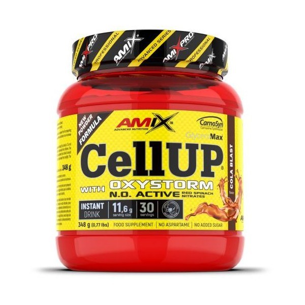 La nueva fórmula de CellUp® with Oxystorm ha sido mejorada con Oxystorm®, que ofrece entre cuatro y cinco veces más nitrato que el polvo de remolacha y 50 veces más nitrato que el jugo de remolacha. Oxystorm toma lo «mejor» de las propiedades de la espinaca roja, aislando en un ingrediente que optimiza su potencial. Además contiene GlyceroMax®, una forma patentada y altamente concentrada de glicerol y sílice; una alta dosis de CarnoSyn®, una forma patentada de beta alanina; así como cafeína, taurina, clorhidrato de L-Arginina, glucuronolactona, vitamina B6 y vitamina C.