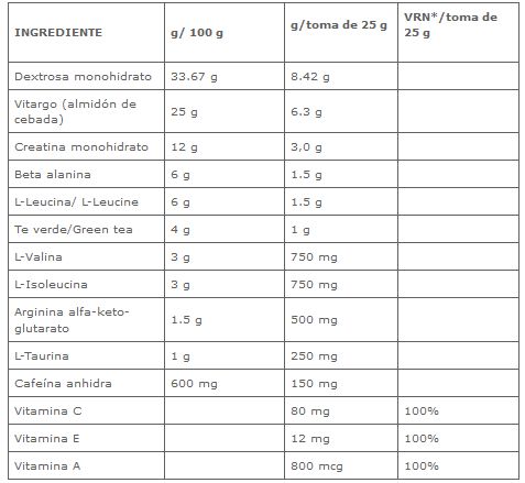Dextrosa monohidrato, almidón de maíz (Vitargo®*), Creatina monohidrato, Beta alanina, L-Leucina, Té Verde (Camellia sinensis, -hojas-) extracto seco (50% polifenoles), L-Isoleucina, L-Valina, Arginina Alfa-Keto-glutarato, L-Taurina, Aroma limón, Acidulante (Ácido cítrico), Antiaglomerante (Dióxido de silicio), Cafeína anhidra, Ácido ascórbico (Vitamina C), Acetato de alfa tocoferol (Vitamina E), Acetato de retinol (Vitamina A), Edulcorante (Sucralosa).