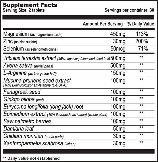 Extracto de Tribulus Terrestris, Avena sativa (partes aéreas), L-arginina (como L-arginina HCl), Extracto de semilla de Mucuna Pruriens [10% L-dihidroxifenilalanina (L-DOPA)], Semilla de alholva, Ginkgo Biloba (hoja), raíz de Eurycoma Longifolia (long jack), Extracto de Epimedium (10% de flavonoides como icariin) (planta entera), Saw Palmetto Bayas, Hoja de Damiana, Cnidium Monnieri (partes aéreas), Xanthoparmelia Scabrosa (liquen), Magnesio (como óxido de magnesio), Zinc (como sulfato de zinc), Selenio (como selenometionina).