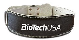 El cinturon de Bodybuilding de BioTech USA es un cinturon robusto de cuero negro reforzado con insercciones de cartón, acolchado en las lumbares y el logotipo de Biotech USA serigrafiado.