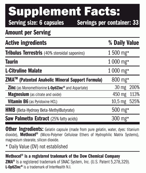 Tribulus terrestris (40% saponinas esteroides), taurina, L-malato de citrulina, ZMA® (fórmula anabólica patentada de apoyo mineral), zinc (como monometionina L-aspartato y OptiZinc®), magnesio (como citrato y óxido), vitamina B6 (como piridoxina HCl), HMB (beta-hidroxi beta-metilbutirato), extracto de Saw Palmetto (25% ácidos grasos), estabilizador: hidroxipropil metilcelulosa Methocel®, antiaglomerantes: estearato de magnesio, dióxido de silicio, cápsula de gelatina (a base de gelatina pura, agua, colorantes: dióxido de titanio)