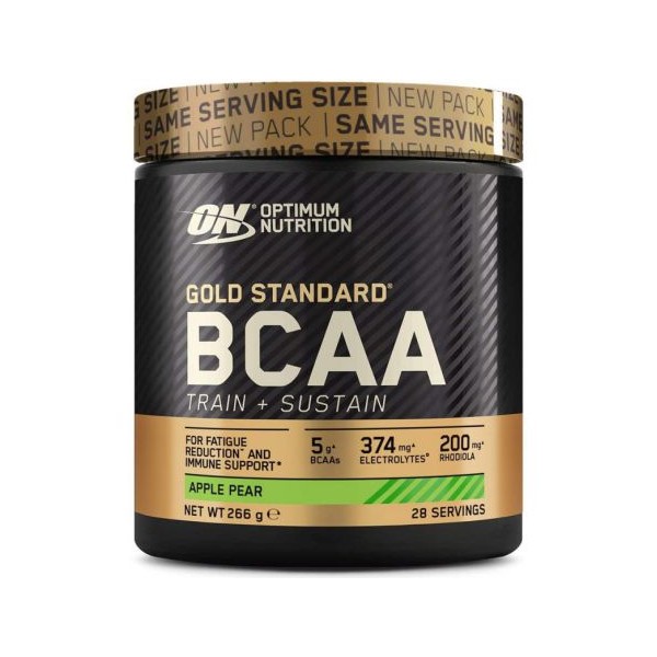 Gold Standard BCAA™ de Optimum Nutrition es un suplemento en polvo que contiene una mezcla de aminoácidos de cadena ramificada en una proporción 2:1:1 reforzada con el nuevo compuesto de betaglucanos Wellmune®, extracto de raíz de Rhodiola Rosea, electrolitos y vitamina C.