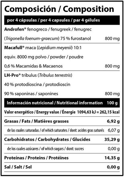 Androfen® (extracto seco de fenogreco (trigonella foenum-graecum) estandarizado para un 75% de furostanol), Macafull® (extracto de maca (lepidium mayenii) estandarizado 10:1 equivalente a 8000 mg de polvo de maca 0,6% macamidas y macaenos), LHPro® (extracto de tribulus terrestris estandarizado para un 90% saponinas y un 40% protodioscinas).