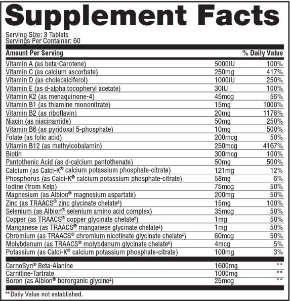 Vitamina A (como beta caroteno), Vitamina C (como ascorbato de calcio), Vitamina D (como colecalciferol), Vitamina E (como acetato de tocoferol d-alfa), Vitamina K2 (como menaquinona-4), Vitamina B1 (como mononitrato de tiamina), Vitamina B2 (como riboflavina), Niacina (como niacinamida), Vitamina B6 (como piridoxal 5-fosfato), Folato (como ácido fólico), Vitamina B12 (como metilcobalamina), Biotina, Ácido pantoténico (como pantotenato d-calcio), Calcio (como Calci-K® calcio fosfato citrato de potasio), Fósforo (como Calci-K® calcio fosfato-citrato de potasio), Yodo (de Kelp), Magnesio (como aspartato de magnesio Albion®), Zinc (como quelato de glicinato de zinc TRAACS® ‡), Selenio (como complejo de aminoácidos de selenio Albion®), Cobre (como quelato de glicinato de cobre TRAACS® ‡), Manganeso (como quelato de glicinato de manganeso TRAACS® ‡), Cromo (como TRAACS® cromo nicotinato glicinato quelante ‡), Molibdeno (como quelato de glicinato de molibdeno TRAACS® ‡), Potasio (como Calci-K® calcio fosfato citrato de potasio), Beta-Alanina (como Carnosyn®), carnitina-Tartrato (como Carnipure™), Boro (como glicina bororgánica Albion® ‡).