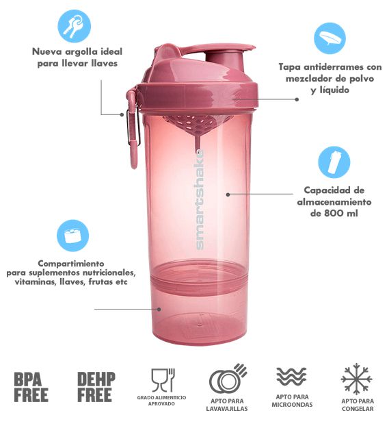 Shaker de plástico de alta calidad con 800 ml de capacidad, más compartimento de almacenamiento de 150 ml.