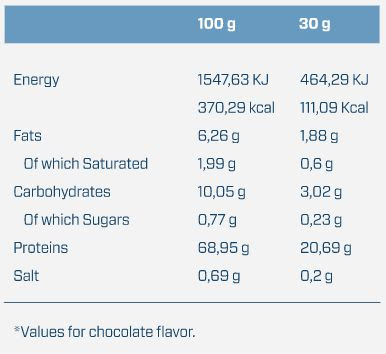 Proteína de guisante 54,5%, proteína de arroz 23,5%, cacao desgrasado (Theobroma cacao L.), aromas: aroma de chocolate, aroma de nata, saborizante: bitter blocker, edulcorante: sucralosa.