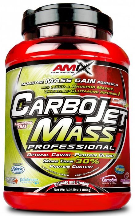 CarboJet Mass™ Professional de Amix™ Nutrition es un suplemento en polvo que contiene una combinación de hidratos de carbono de alta calidad incluyendo Vitargo®, Palatinosa®, maltodextrina, fructosa y dextrosa, con una mezcla proteica que incluye suero de leche sin grasa, concentrado de proteína de suero WPC y aminoácidos derivados de proteína de ternera hidrolizada, potenciado con diferentes tipos de creatinas, glutaminas, BCAA's, citrulina, beta alanina (CarnoSyn®) y enzimas digestivas que ha sido especialmente diseñado para favorecer una rápida ganancia de masa muscular.