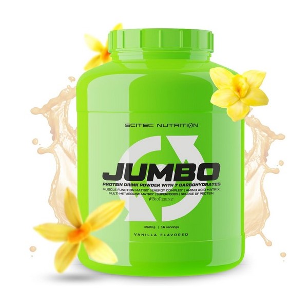 Jumbo de Scitec Nutrition es un suplemento en polvo que contiene una fórmula todo en uno para ayudarte a ganar fuerza y masa muscular con proteína de suero de la más alta calidad, una matriz con 6 tipos de carbohidratos diferentes, creatina, importantes aminoácidos, una matriz metabólica con BioPerine®, vitaminas, minerales y una combinación de superalimentos.