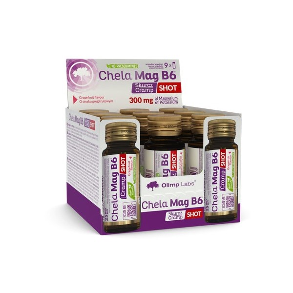 Chela-Mag B6® Cramps Shot de Olimp Sport Nutrition es un suplemento en ampollas bebibles de rápida acción que proporciona 300 mg de magnesio en forma de aminoácido quelato por Albion® (como diglicinato de magnesio, una forma altamente absorbible de magnesio) y 300 mg de potasio (como citrato de potasio, una forma altamente absorbible de potasio) potenciado con las vitaminas B6, B1, B12 y B2, que ha sido diseñada para favorecer el correcto funcionamiento muscular evitando los molestos calambres, así como el funcionamiento del sistema nervioso y cardiovascular.