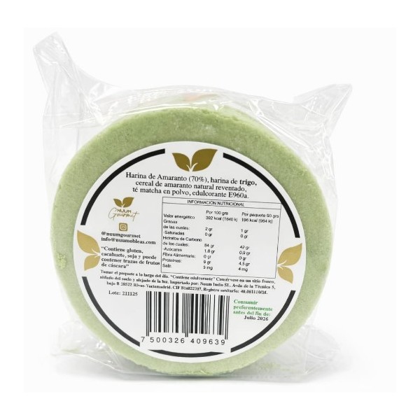 Harina de amaranto (70%), harina de trigo, cereal de amaranto natural reventado, té matcha en polvo, edulcorante E960a.