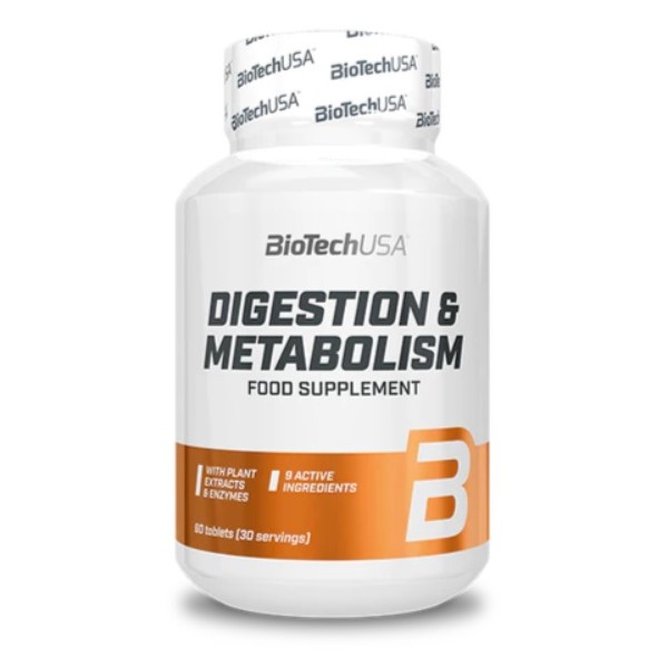 Digestion & Metabolism de BioTech USA es un suplemento en tabletas que contiene una combinación de extractos vegetales (ajo, jengibre, curcuma y corteza de canela), enzimas digestivas (bromelaina y papaína), minerales (zinc y cromo) y biotina, que ha sido diseñado para mejorar la digestión y el metabolismo de los macronutrientes.