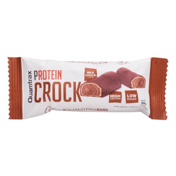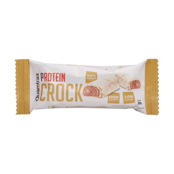 Protein Crock de Quamtrax Nutrition son unos deliciosos barquillos altos en proteínas y fibra, rellenos de irresistible crema de avellanas y recubiertos de una capa de chocolate blanco o de chocolate con leche.