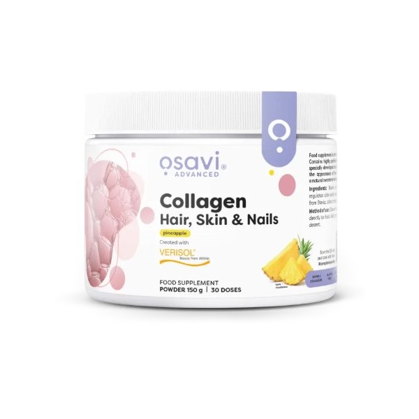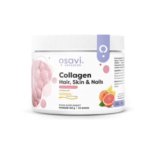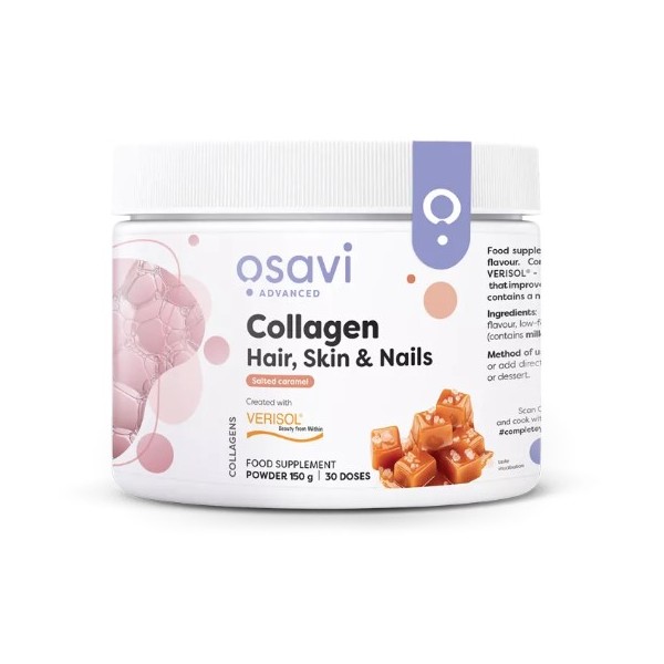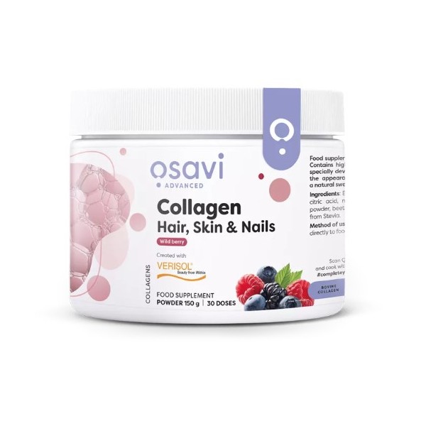 Collagen Hair, Skin & Nails de Osavi es un suplemento en polvo con un refrescante sabor a bayas o caramelo salado que contiene colágeno Verisol® (péptidos de colágeno bioactivos), posiblemente el mejor colágeno del mercado hoy en día para el cuidado de la piel, el cabello y las uñas.