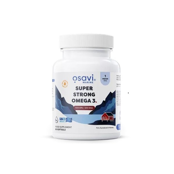 Super Strong Omega 3 de Osavi es un suplemento en perlas que contiene aceite de pescado súper concentrado y purificado por destilación molecular que contiene ácidos grasos insaturados esenciales (250 mg DHA y 500 mg EPA).