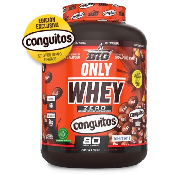 Only Whey™ Zero Conguitos de Big Nutrition es un suplemento en polvo que contiene el 100% de concentrado de proteína de suero Volactive® Ultrawhey 80 instant, enriquecida con Tolerase L-Lactasa® para mejorar significativamente la digestión de la lactosa contenida en el suero, y doblemente edulcorada con Stevia y Splenda®.