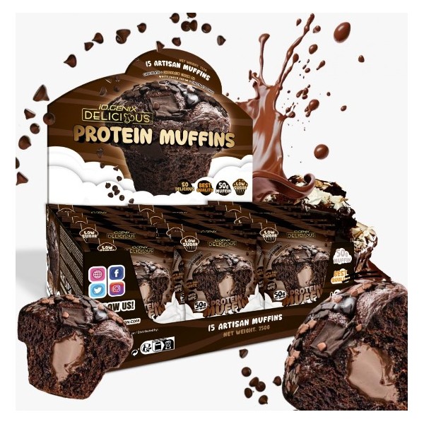 Protein Muffins de IO.Genix son unas deliciosas magdalenas artesanales con chips de chocolate muy bajas en azúcar disponibles en dos irresistibles versiones: magdalena de chocolate con crema de chocolate blanco y magdalena de chocolate con crema de chocolate negro.