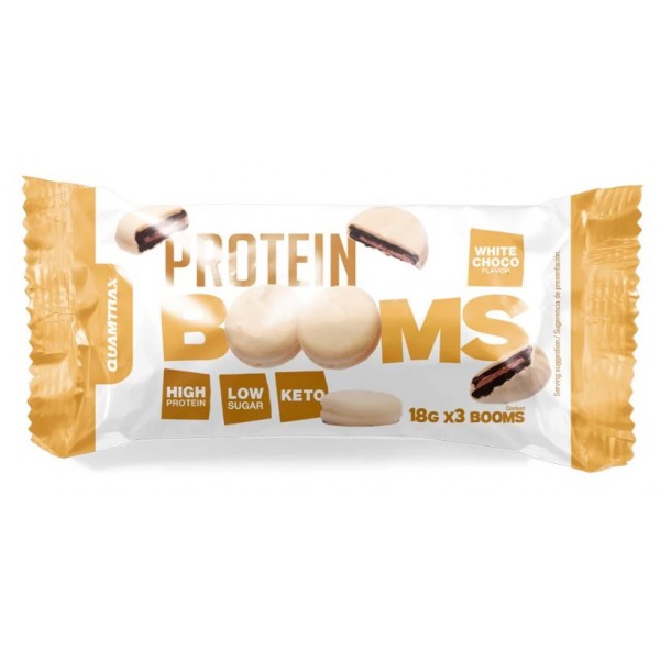 Protein Booms de Quamtrax Nutrition son unas increíbles galletas altas en proteína recubiertas de delicioso chocolate con leche o chocolate blanco y rellenas de irresistible crema, perfectas para quienes buscan una opción nutritiva y baja en azúcares e hidratos de carbono.
