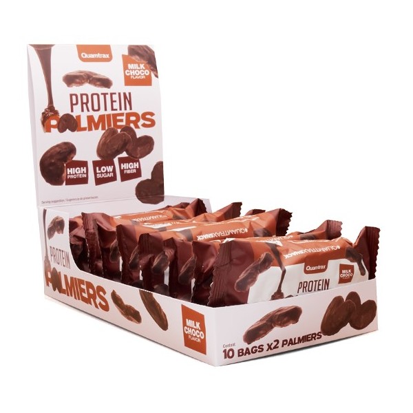 Protein Palmiers de Quamtrax Nutrition son unas deliciosas palmeritas de hojaldre caramelizado cubiertas de chocolate con leche, altas en proteínas, bajas en azúcares y con un alto contenido en fibra.